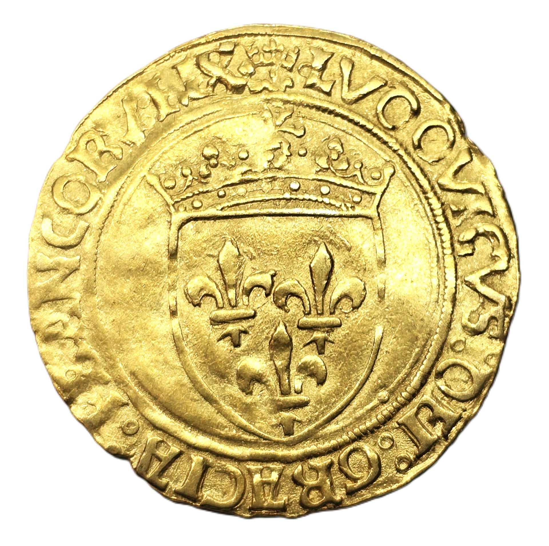 D’époque Renaissance, Cet Écu d’or au soleil fut frappé l’année même ou Louis XII accéda au trône. Avers : un écartelé de France-Dauphiné sous un soleil, revers : une croix fleurdelisée avec quadrilobe en cœur. Légendée: Au droit circulaire : “+ LVDOVICVS DEI GRA FRANCO REX” – revers circulaire : “XPC VINCIT XPC REGNAT XPC IMPERAT”.